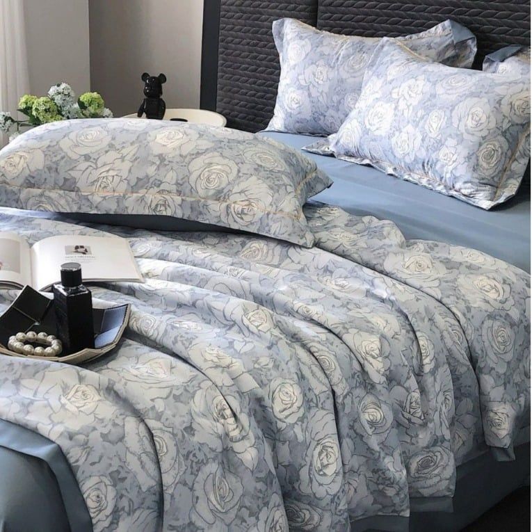 B21 - Bộ Chăn Ga Gối Lụa Thái 4 Món Hoa Lụa Xanh