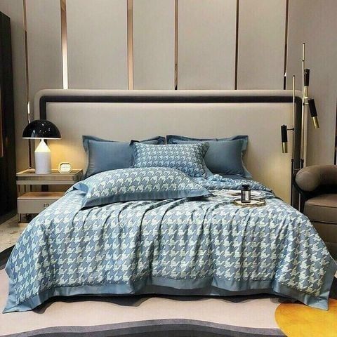 B74 - Bộ Chăn Ga Gối Lụa Thái 4 Món Caro Xanh